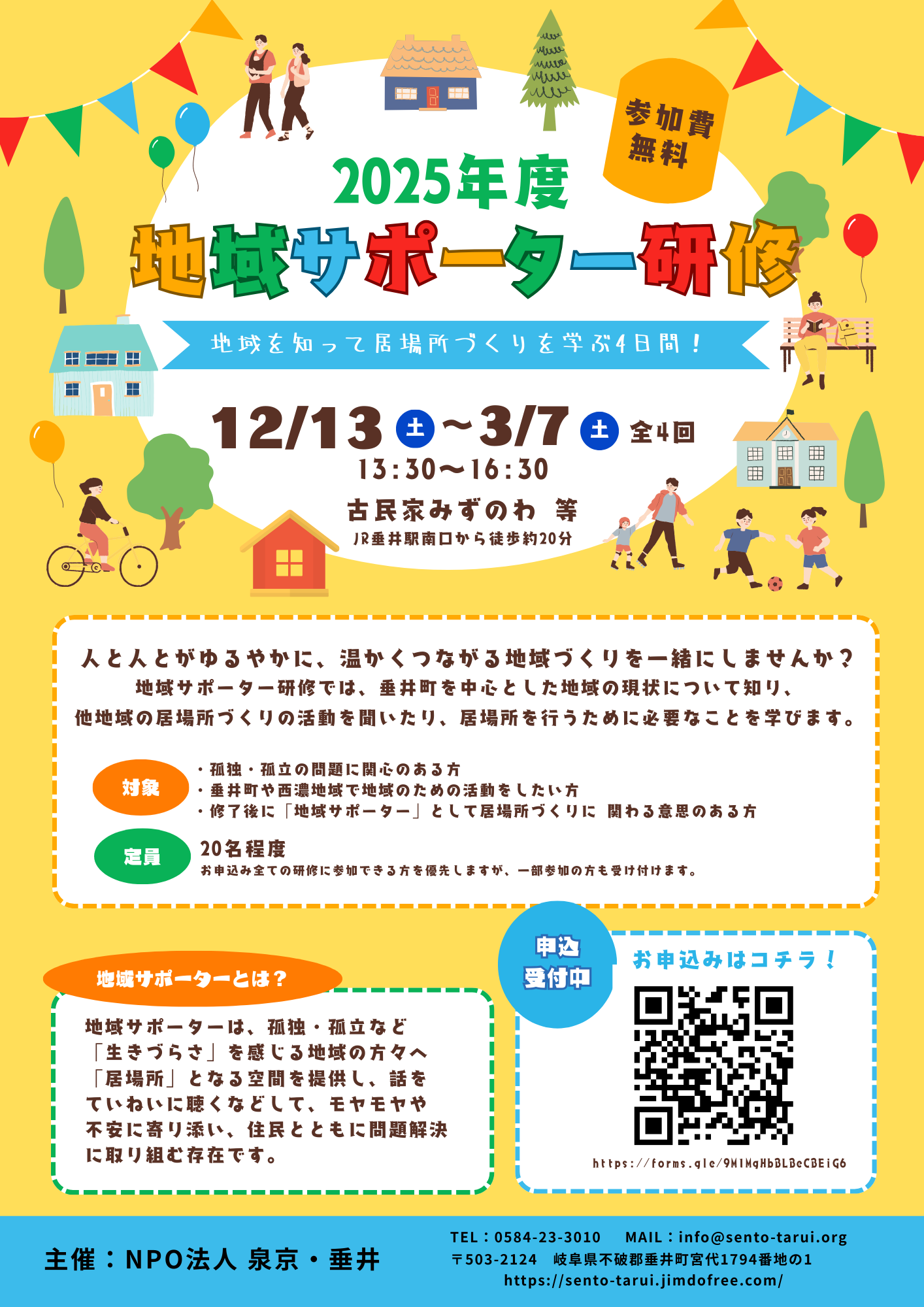 | 活動内容 | 垂井町に暮らす住民誰もが、垂井町のまちづくりに自ら参画し、行政、事業者・企業などと協働しながら”幸福度の高いまち・垂井”を実現することを目的として、垂井町を中心とした西濃地域を拠点に活動しています。 |