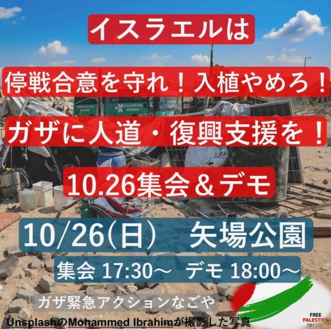 10月26日(日) 集会&デモ  17時半~集会 18時~デモ 矢場公園 10月31日(金)  街頭宣伝  12時~名鉄名駅前定期街頭宣伝              13時半~海外物産抗議行動 11月...