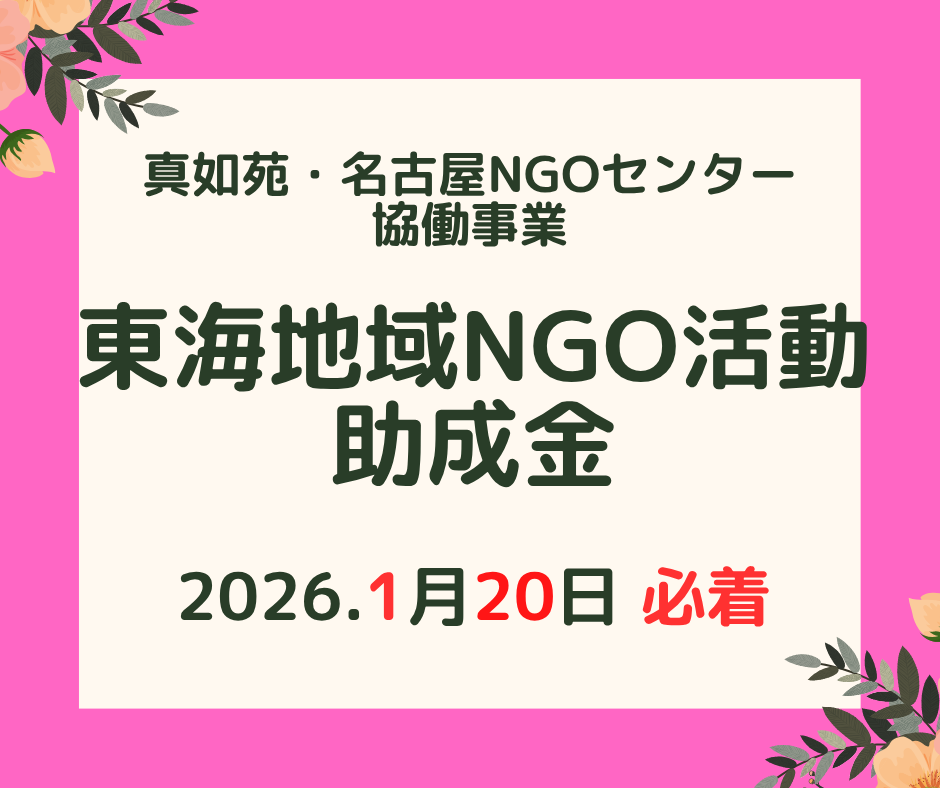 今年も「東海地域NGO活動助成金」の対象事業を募集します。 本助成金の助成資金は宗教法人真如苑からの寄付によるものです。 名古屋NGOセンターはこの寄付が有効に生かされるよう助成団体を公募します。 ◆...