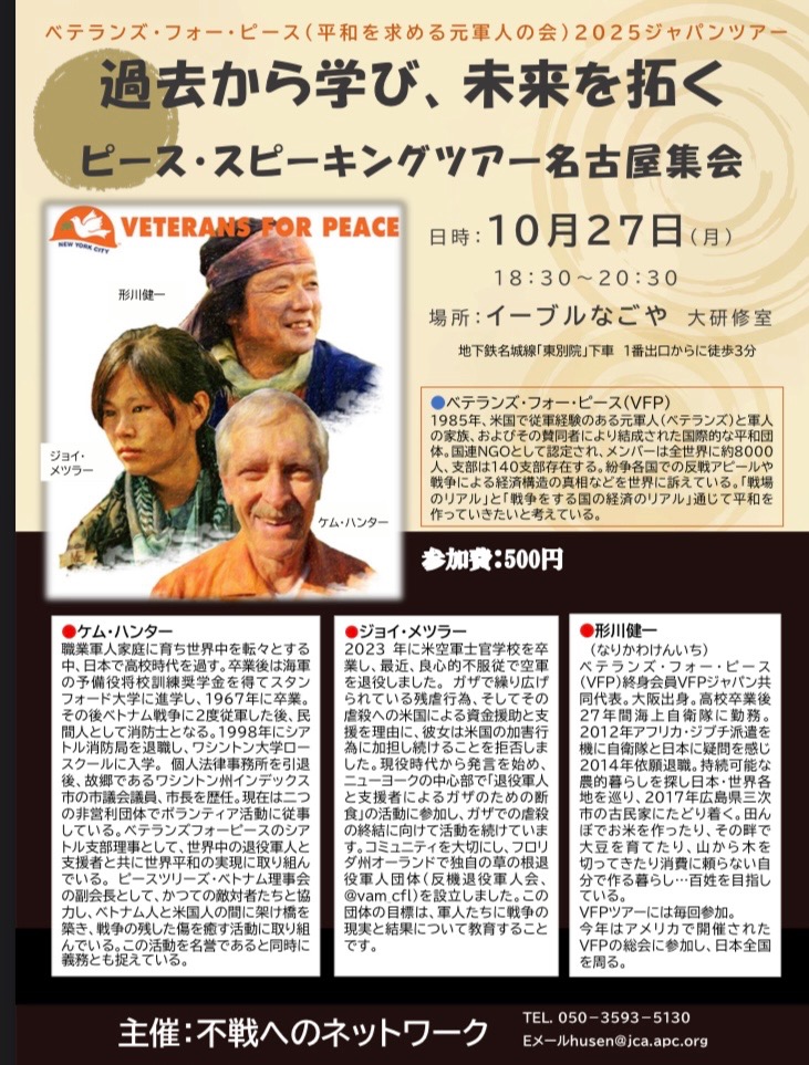 ベテランズ・フォー・ピース(平和を求める元軍人の会)過去から学び、未来を拓く 10月27日(月)18:30~20:30 イーブルなごや大会議室 500円...
